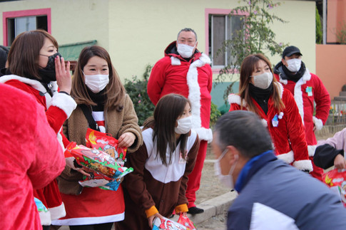 流石に子どもたちのジャングルジムにはなれなかったものの、お行儀よく一列に並んだ子どもたちに、代表スタッフがプレゼントを渡し、メンバーがそれをほのぼのと見守る形に。